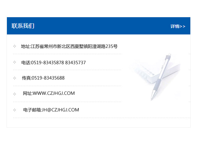 地址:常州市新北區友邦商務大廈1幢16、17層  電話:0519-85101652  傳真:0519-85112595  郵編:213022  網址:www_cz-jiayue_cn.jiupianqi.com  郵箱:xiajifengaa@163.com